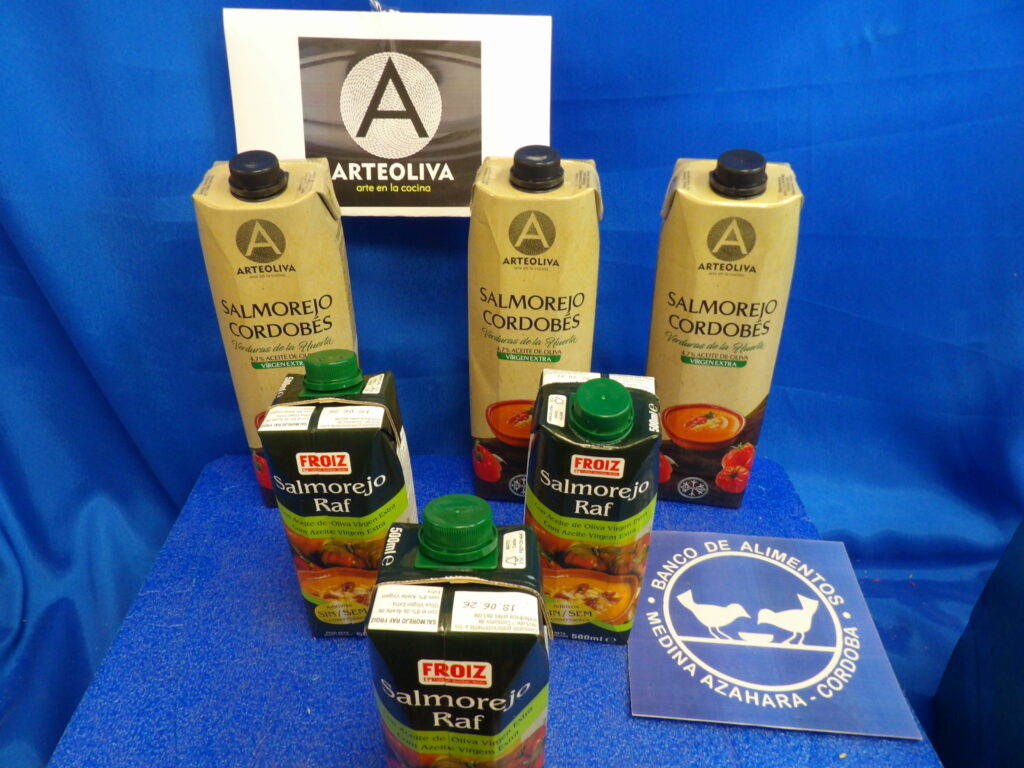 El lote se desglosa en Salmorejo Córdobés y Salmorejo Raf, y sin duda suponen  un complemento inesperado para la dieta alimenticia que proporciona el Banco de Alimentos a las personas necesitadas de Córdoba y provincia.